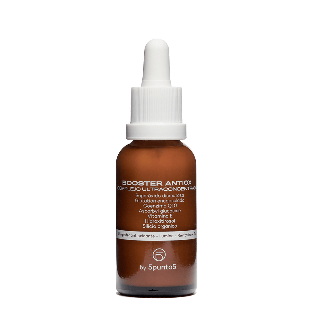 El Booster Antiox de 5punto5 incluye en su composición los mismos antioxidantes que se encuentran de manera natural en la piel, reforzando y recargando así la capacidad de protección de la piel. Entre los antioxidantes incluidos en este serum encontramos la Superóxido Dismutasa, Coenzima Q10, Ascorbyl Glucoside (Vitamina C estabilizada), Vitamina E, Glutatión Encapsulado y el Hidroxitirosol. Este complejo de activos refuerza la capacidad de defensa, combate el estrés oxidativo ayudando a revertir los signos del envejecimiento prematuro y mejora la luminosidad y el tono de la piel.