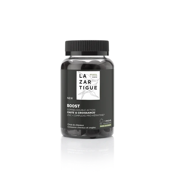 El complemento alimenticio BOOST Gummies de doble acción, frena la caída del cabello₁ y estimula su crecimiento para combatir eficazmente la pérdida₁ Ayuda a frenar la caída. Estimula el crecimiento. Fortalece el cabello y las uñas. Aroma natural, delicioso sabor a frambuesa-grosella. Vegano. Sin azúcar. Sin colorantes artificiales. Aromas naturales