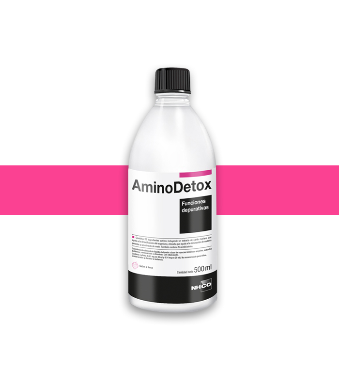 AminoDetox. Función Depurativa. Combina 20 ingredientes activos incluyendo un extracto de cardo mariano que ayuda a la detoxicación del organismo, chlorella que ayuda a la eliminación de metales pesados y un extracto de mate. También contiene N-acetilcisteína. Apto para vegetarianos y veganos. Complemento alimenticio con edulcorante. Sabor a fresa