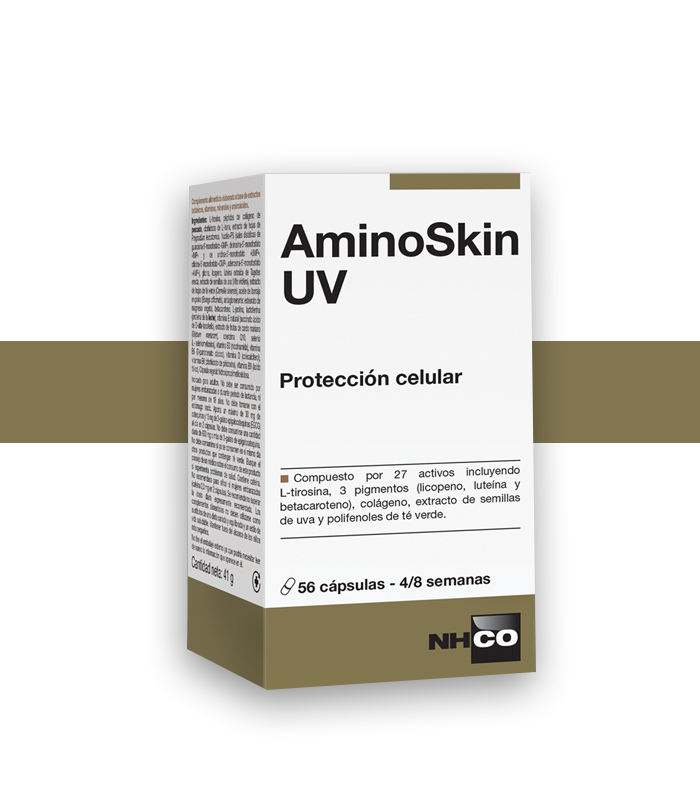AminoSkin UV capsulas de protección celular. Compuesto por 27 activos incluyendo L-tirosina, 3 pigmentos (licopeno, luteína y betacaroteno), colágeno, extracto de semillas de uva y polifenoles de té verde.