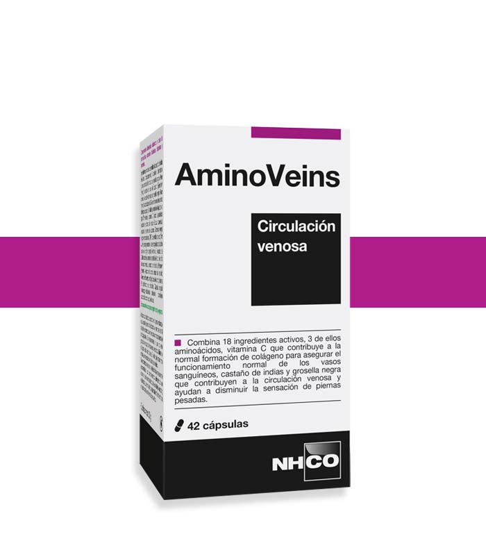 AminoVeins. Circulación Venosa. Combina 18 ingredientes activos, 3 de ellos aminoácidos, vitamina C que contribuye a la normal formación de colágeno para asegurar el funcionamiento normal de los vasos sanguíneos, castaño de indias y grosella negra que contribuyen a la circulación venosa y ayudan a disminuir la sensación de piernas pesadas. Apto para vegetarianos y veganos