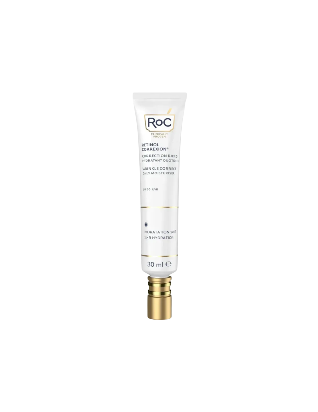 RoC Wrinkle Correct Hidratante de Día SPF30 es una crema hidratante antiedad de uso diario especialmente formulada para reducir visiblemente la apariencia de arrugas profundas y líneas de expresión, mientras protege la piel frente a la radiación UV que acelera el envejecimiento cutáneo. Su fórmula combina retinol con un sistema hidratante ligero y efectivo que mejora la textura y la firmeza de la piel, sin sensación grasa. Gracias a su protección solar SPF 30, este hidratante ayuda a prevenir el fotoenvejecimiento, minimizando el impacto nocivo de los rayos UVA/UVB, al mismo tiempo que aporta confort, suavidad y un tono más uniforme.