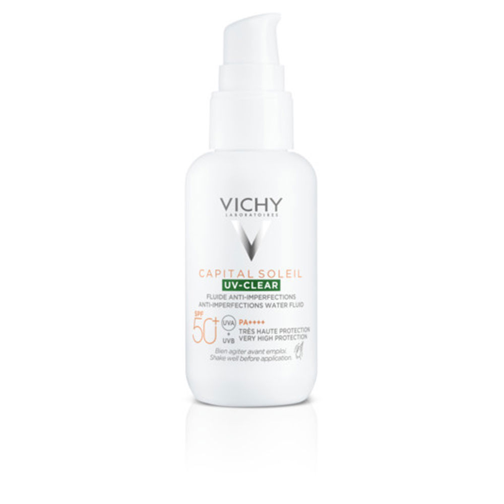Vichy Capital Soleil SPF50+ UV-Clear Fluido Antiimperfecciones 40ml, protege la piel del sol, al mismo tiempo que matifica y reduce las imperfecciones. Formulado con alta protección contra los rayos UVA y UVB, la polución y los agentes externos, tiene la capacidad de prevenir arrugas y manchas. Ideal para pieles mixtas, grasas y con tendencia acneica.